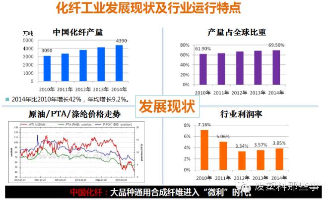 “十二五”期间,国家把“废旧纺织品、废旧塑料资源化利用”定性为节能环保战略性新兴产业,再生化学纤维行业是落实国家循环经济、建设资源型节约社会的重要践行者,符合低碳经济的发展模式和“可持续发展”国家战略。 新常态在国内外经济下行压力加大的背景下,国内经济增长从高速转向中低速的发展过程中,企业的经营效益都不是很好。国内产能过剩,行情下滑,减产停产…化纤行业是否又迎来了一次洗牌?实际上今年的经营困境并非突发情况,而是前几年实体经济的累积和延续。