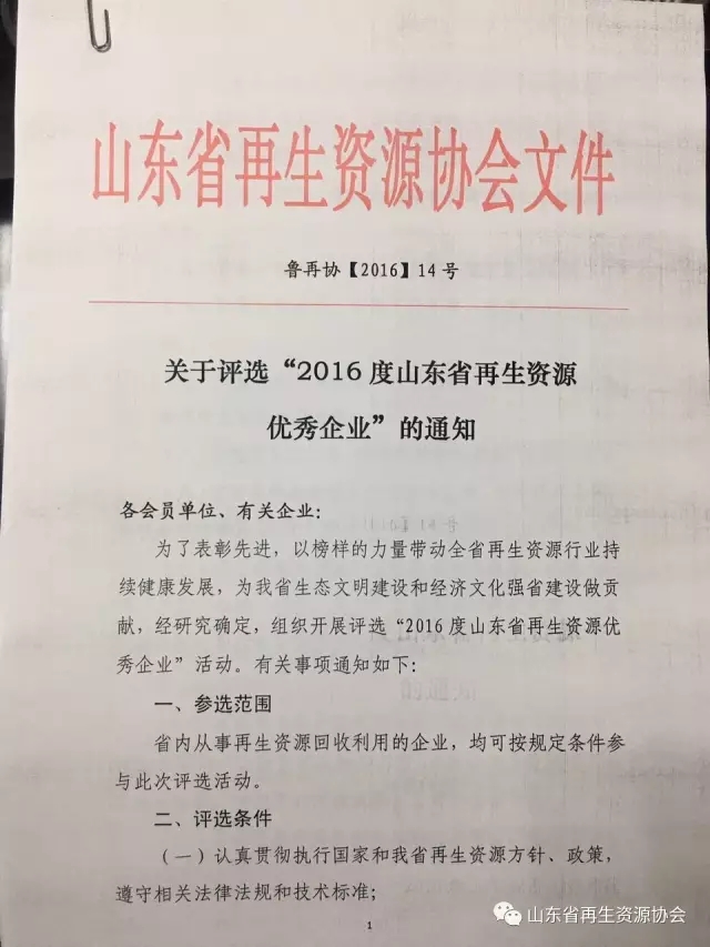 关于评选“2016年度山东省再生资源优秀企业”的通知